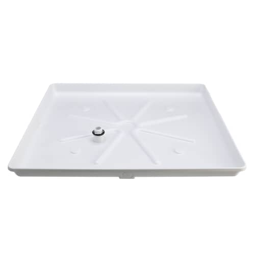 Protect your laundry area floor from accidental water damage with the genuine GE PM7X1 Washer Floor Tray. This durable, white square tray is designed to sit under your washing machine, catching potential leaks from hoses or the tub and channeling them safely to the floor drain using the included threaded adapter fitting.